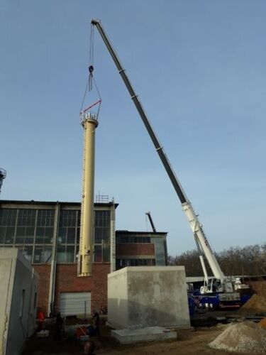 Zwischen den Stationen wird ein gemeinsamer Stahlschornstein mit 21 m Höhe errichtet, an dem alle vier Erzeuger angeschlossen sind.