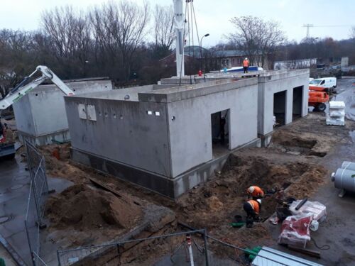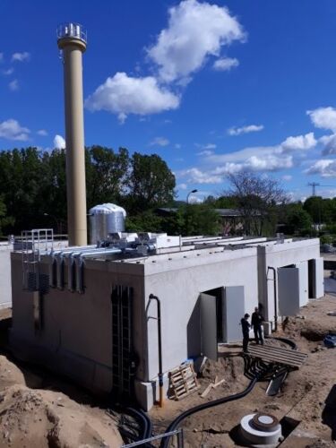 Die Aufstellung der Erzeugeranlagen 2 x BHKW und 2 x Kessel sowie der Netzpumpenanlage und der Netzdruckhaltung erfolgt in neu zu errichtenden Bauwerken in Form von Fertigteil-Betonstationen. Die BHKW-Station beinhaltet 2 BHKWs mit je 499 kW elektr. Leistung sowie die für den Betrieb erforderliche Medienanbindung. Im Außenbereich wird ein Pufferspeicher mit 50 m³ Volumen errichtet.