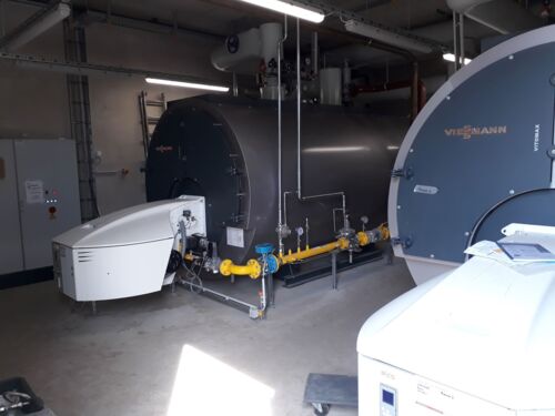 In der Kessel-Station sind 2 Gaskessel mit je 2,8 MW Feuerungswärmeleistung untergebracht. Die BoP-Station umfasst die Netzpumpen, die Druckhaltung inkl. Nachspeisung und Wasseraufbereitung sowie die Schaltschränke für die Gebäudeleittechnik.